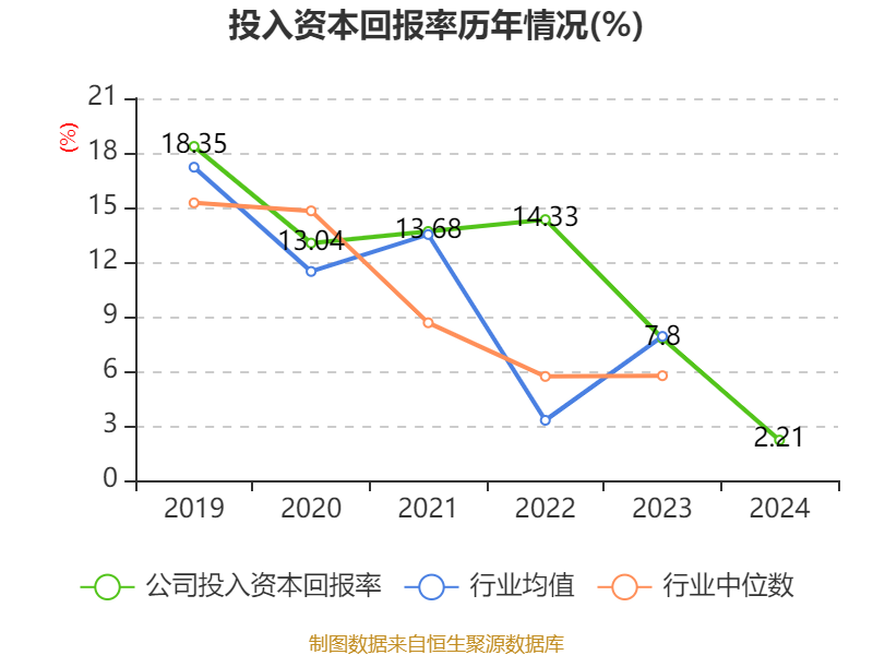 数据显示,2024年公司加权平均净资产收益率为2.55%,较上年同期下降5.76个百分点。公司2024年投入资本回报率为2.21%,较上年同期下降5.59个百分点。