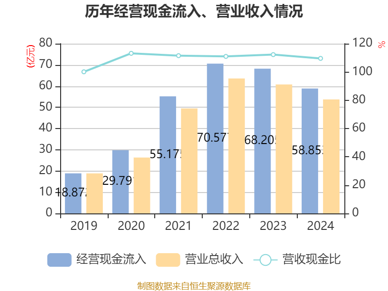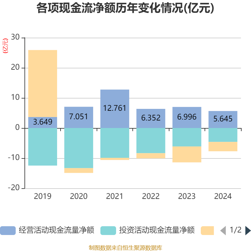 截至2024年,公司经营活动现金流净额为5.65亿元,同比下降19.32%;筹资活动现金流净额-3.11亿元,同比增加2.17亿元;投资活动现金流净额-4.61亿元,上年同期为-6.13亿元。