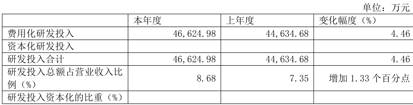 2024年全年,公司研发投入金额为4.66亿元,同比增长4.46%;研发投入占营业收入比例为8.68%,相比上年同期上升1.33个百分点。